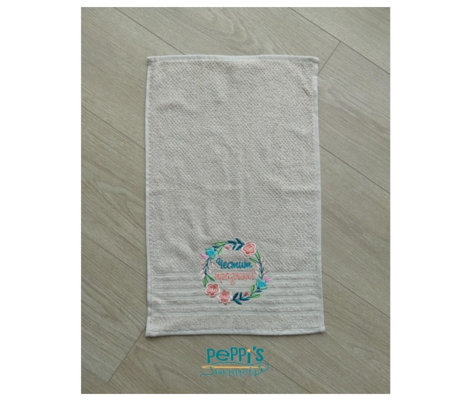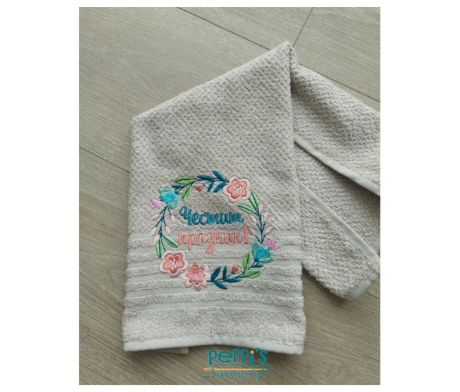 Кухненска кърпа с бродерия "Честит празник" и венец цветя